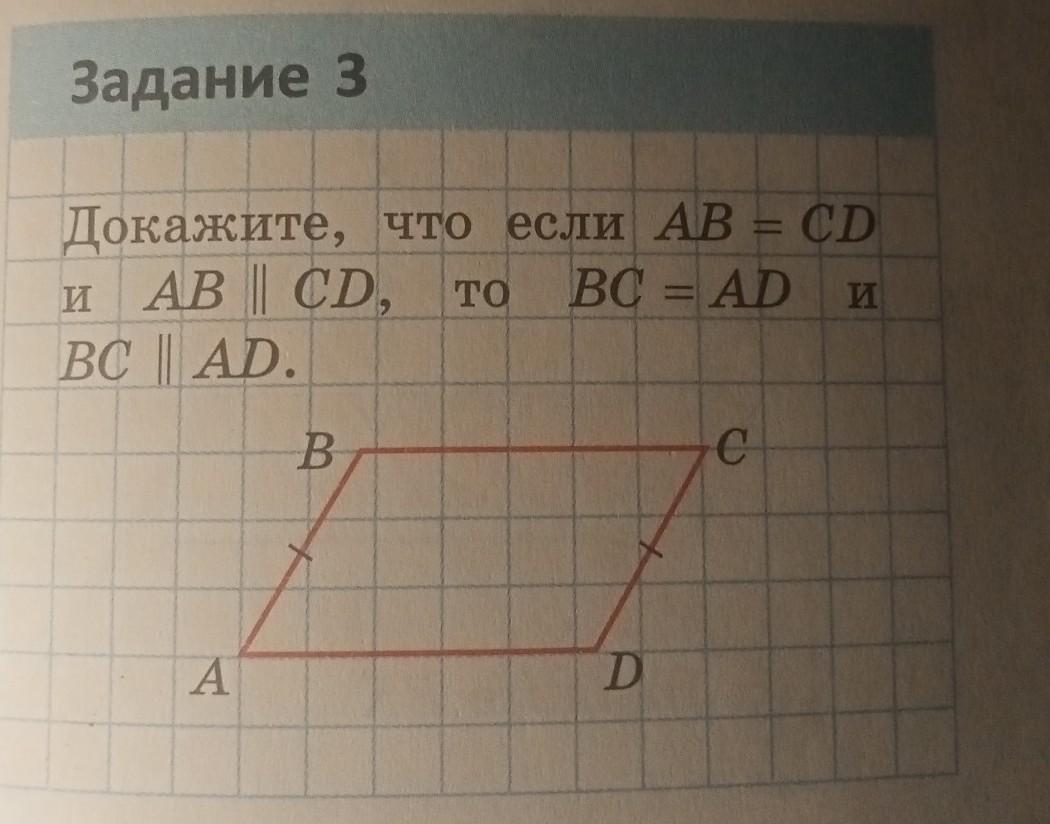 Так як AB = CD і AB||CD, то ABCD паралелограм i BC = AD і BC||AD за властивістю паралелограма.