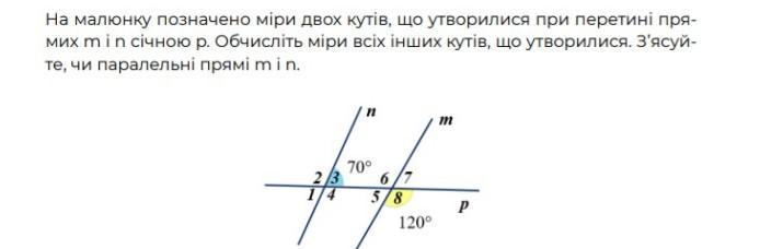 Задача 1. На малюнку позначено міри двох кутів, що утворилися при перетині пря- мих m i n сiчною р. Обчисліть міри всіх інших кутів, що утворилися. З'ясуй- те, чи паралельнi прямi м i п.
