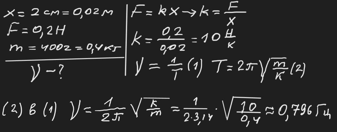Для видовження пружини на 2 см необхідно прикласти зусилля 0,2 Н. Визначити частоту коливань тягаря масою 400 г на цій пружині.