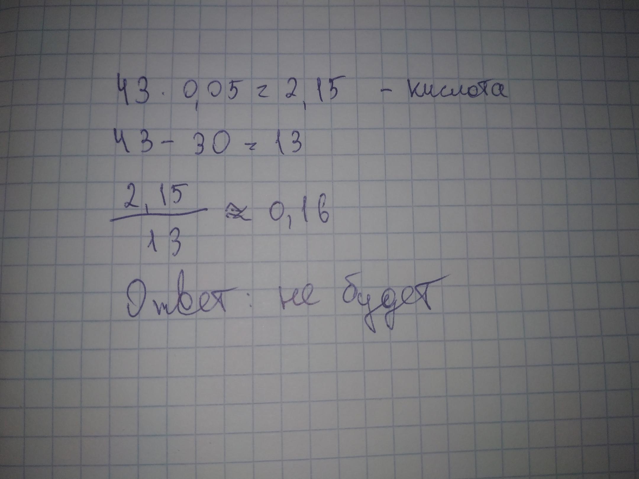 если концентрации кислоты в нем больше либо равна 22%.Будет ли взрывоопасным 5% зелье массой 43 кг, из которого выпарили 30 кг воды?