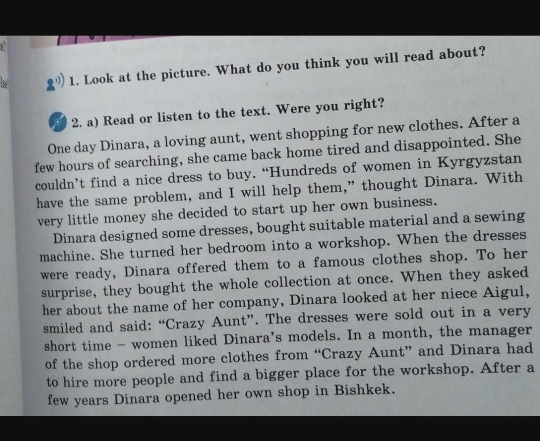 4) Where did she sew her dresses? 5) Was she successful? 6) What did Dinara do when the manager ordered more dresses? 7) What type of shop did she open? 8) What is the name of her company? 9) Why do you think she named it "Crazy Aunt"? c) Work in pairs. Discuss the following questions.
