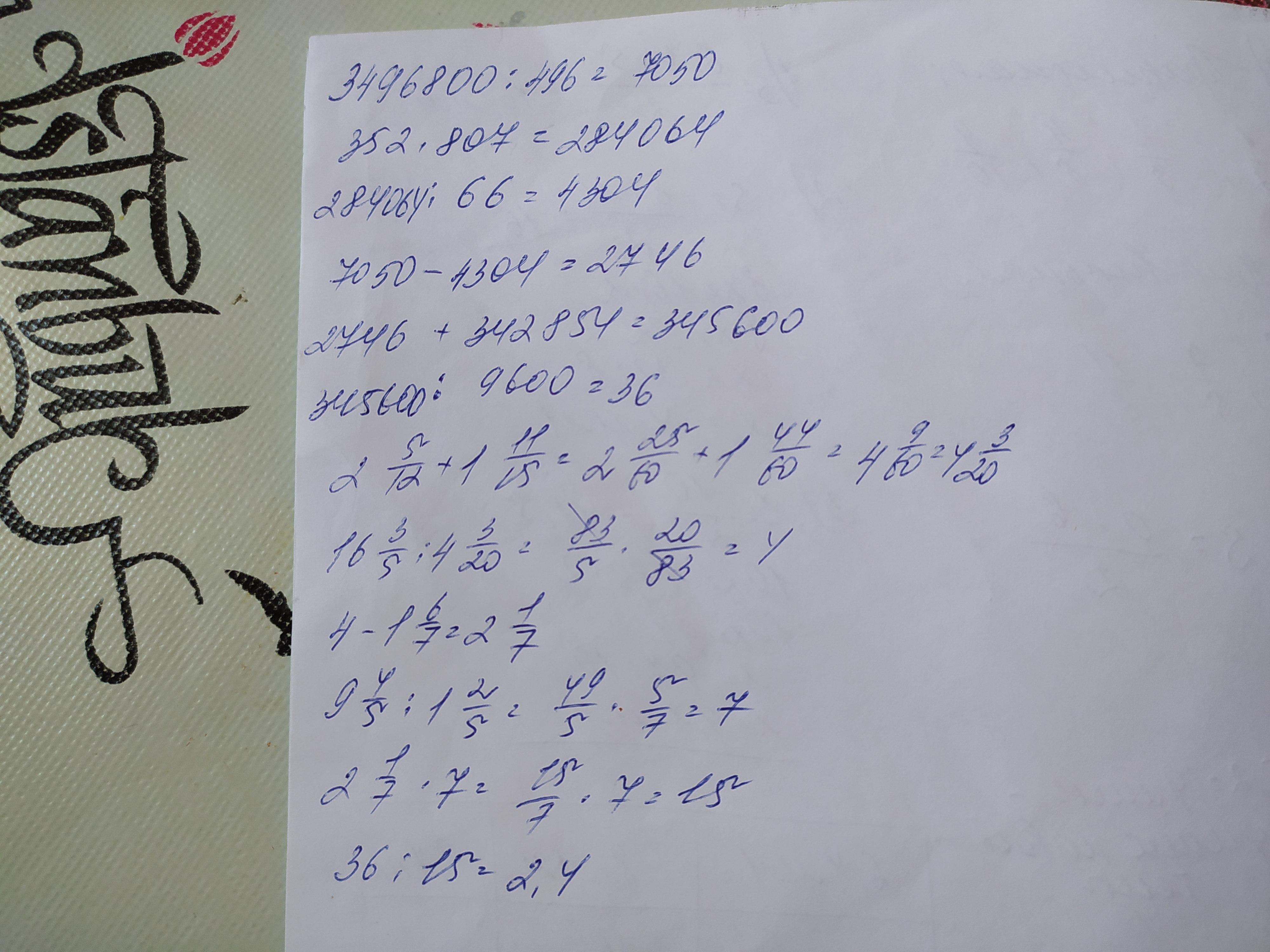 723 Вычисли и запиши ответ в виде десятичной дроби: (3 496 800: 496-352 807:66 +342 854): 9600 (163. (212+175)-14). (91:12) ●