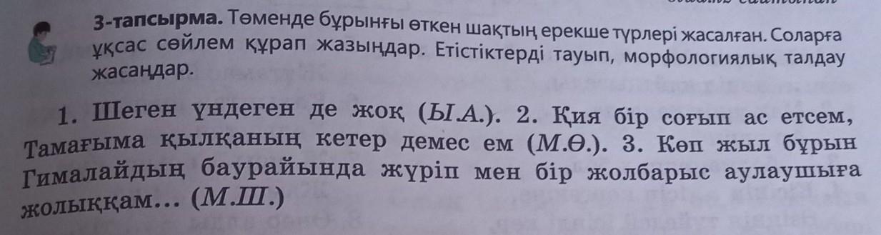 3-тапсырма. Төменде бұрынғы өткен шақтың ерекше түрлері жасалған. Соларға ұқсас сөйлем құрап жазыңдар. Етістіктерді тауып, морфологиялық талдау жасандар. 1. Шеген үндеген де жок (Ы.А.). 2. Кия бір соғып ас етсем, Тамағыма қылқаның кетер демес ем (М.Ө.). 3. Көп жыл бұрын Гималайдын баурайында жүріп мен бір жолбарыс аулаушыға жолыккам... (М.Ш.)