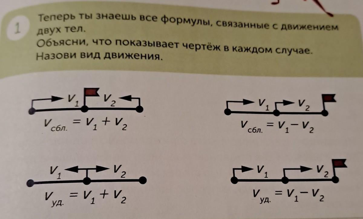 1 Теперь ты знаешь все формулы, связанные с движением двух тел. Объясни, что показывает чертёж в каждом случае. Назови вид движения.