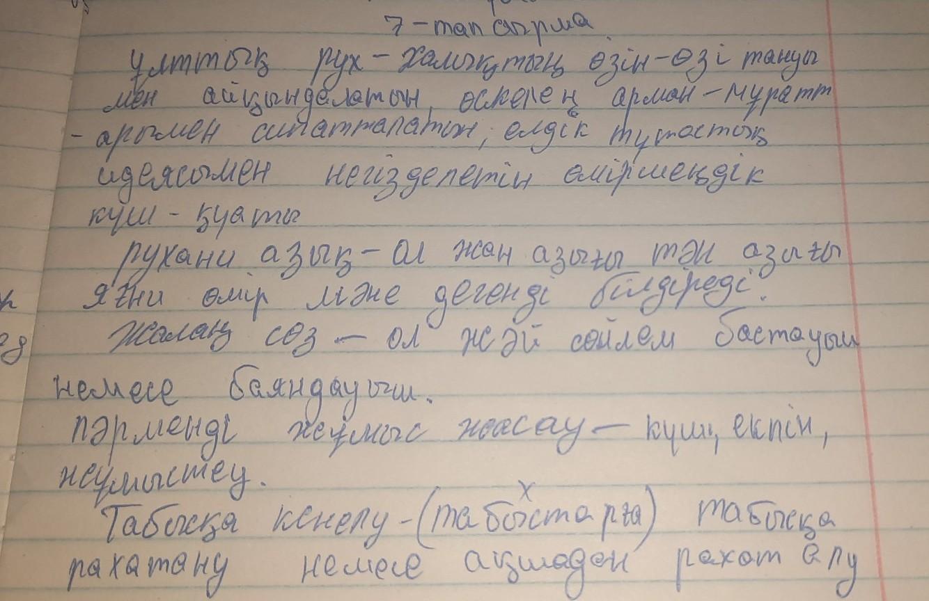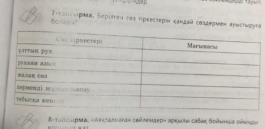 х 7-тапсырма. Берілген сөз тіркестерін қандай сөздермен ауыстыруға болады? Сөз тіркестері улттык рух рухани азык жалан сез пәрменді жұмыс жасау табыска кенелу