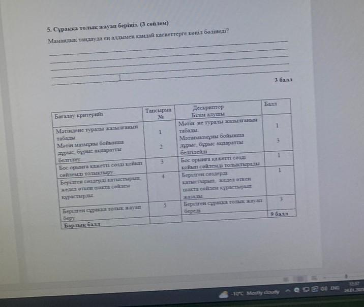 5. Суракка толык жауап берiнi. (3 сойлем) Мен кандай касиеттерге конiл бәлінеді? Tancura Дескриптор 3 622 Батт