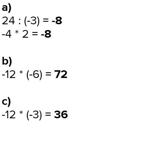 1) 2 * -4 = -8; 2)-12 * -6 = 72; 3)-12 * -3 = 36