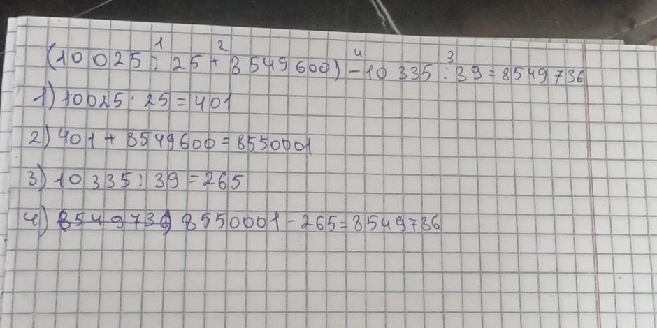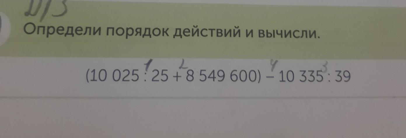 Определи порядок действий и вычисли. 1 2 (10 025:25 +8 549 600) - 10 335:39 пажалуста зделайте фотку или столбиком напишите даю 100балов