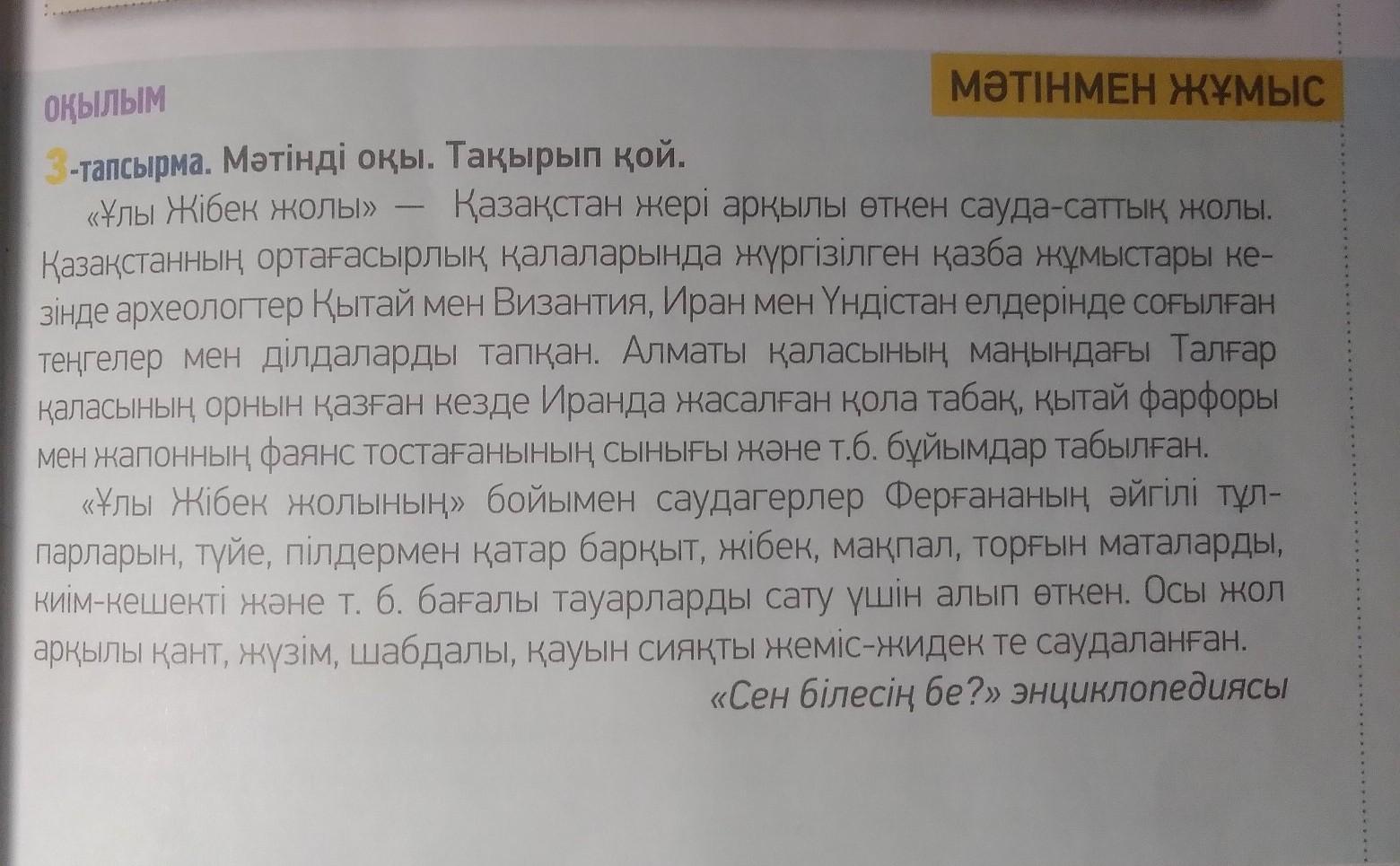 3 -тапсырма. Мәтінді оқы. Тақырып кой. «Ұлы Жібек жолы» Қазақстан жері арқылы өткен сауда-саттық жолы. Казакстанның ортағасырлық қалаларында жүргізілген казба жұмыстары ке- зiнде археологтер Кытай мен Византия, Иран мен Үндістан елдерінде соғылған теңгелер мен ділдаларды тапкан. Алматы қаласының маңындағы Талғар каласының орнын казған кезде Иранда жасалған кола табак, кытай фарфоры мен жапонның фаянс тостағанының сынығы және т.б. бұйымдар табылған. «Ұлы Жібек жолының» бойымен саудагерлер Фергананың әйгілі тұл- парларын, түйе, пiлдермен катар баркыт, жiбек, макпал, торғын маталарды, киім-кешекті және т. б. бағалы тауарларды сату үшін алып өткен. Осы жол аркылы кант, жузiм, шабдалы, кауын сиякты жеміс-жидек те саудаланған. «Сен білесің бе?» энциклопедиясы