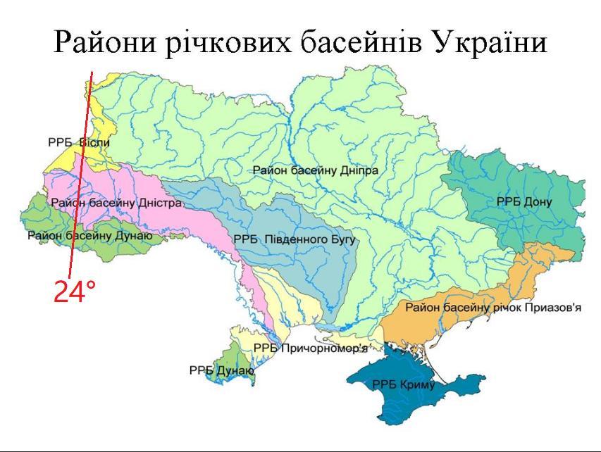 - Послідовність розташування річкових басейнів у межах України в напрямку з півночі на південь уздовж меридіана 24° сх. д.:В, А, Б, Г