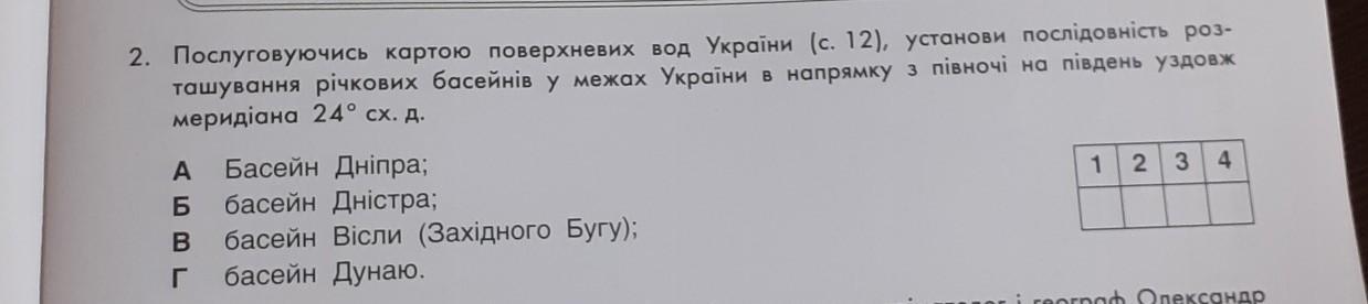 2. Послуговуючись картою поверхневих вод України (с. 12), установи послідовність роз- ташування річкових басейнів у межах України в напрямку з півночі на південь уздовж меридіана 24° сх. д. A Басейн Дніпра; Б басейн Дністра; в басейн Вісли (Західного Бугу); Г басейн Дунаю. 1 2 3 4