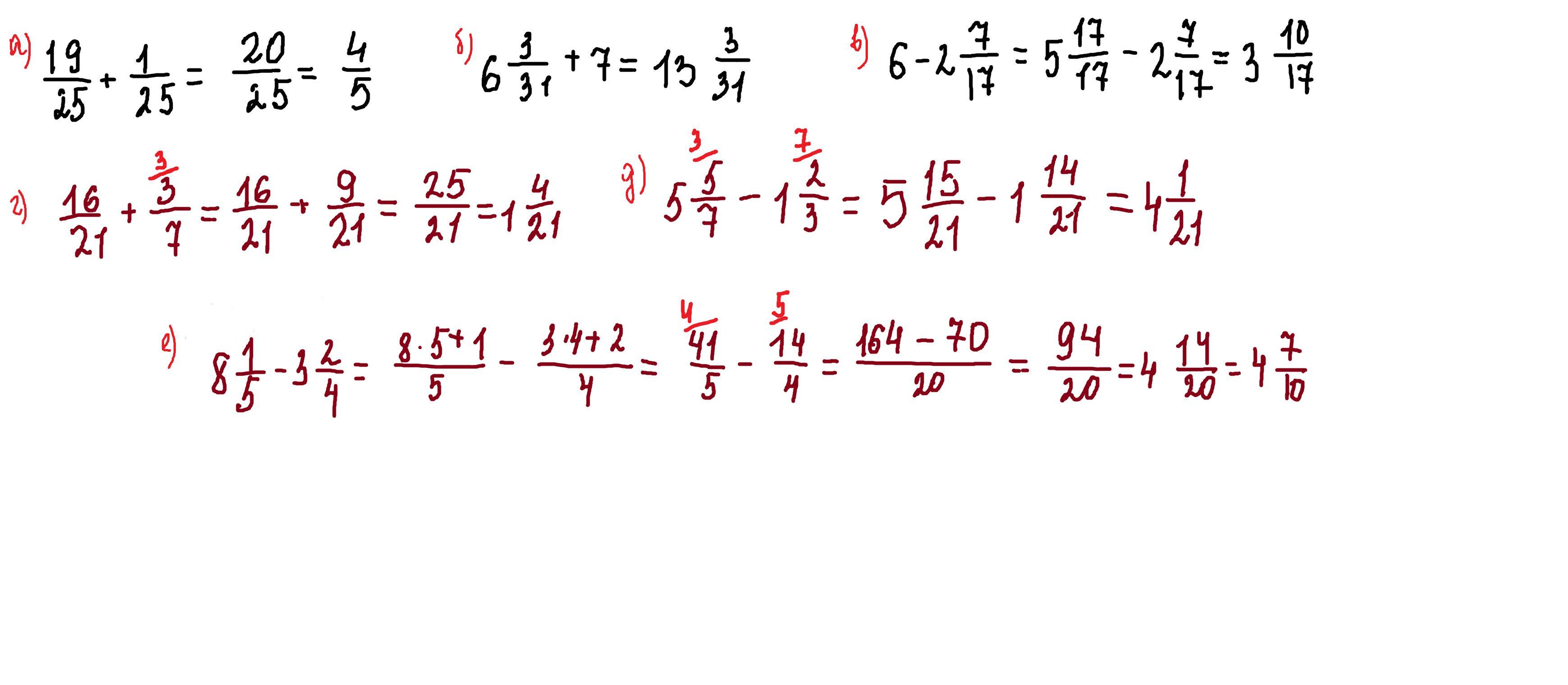 Пошаговое объяснение:чтобы сложить дроби надо сложить их числители,а знаменатель оставить прежним. а в примерах г,д е приводим к новому общему знаменателю.