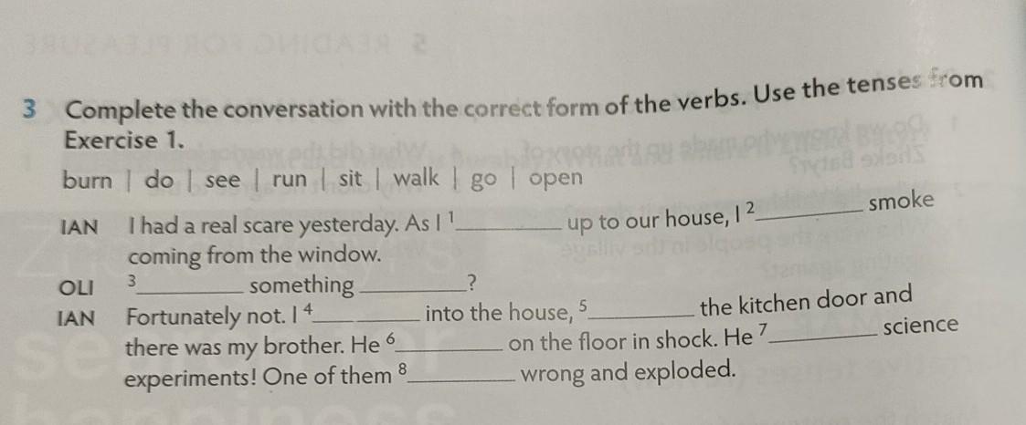 IAN Fortunately not. I⁴ into the house, ⁵ the kitchen door and there was my brother. He ⁶ on the floor in shock. He ⁷ science experiments! One of them ⁸ wrong and exploded.