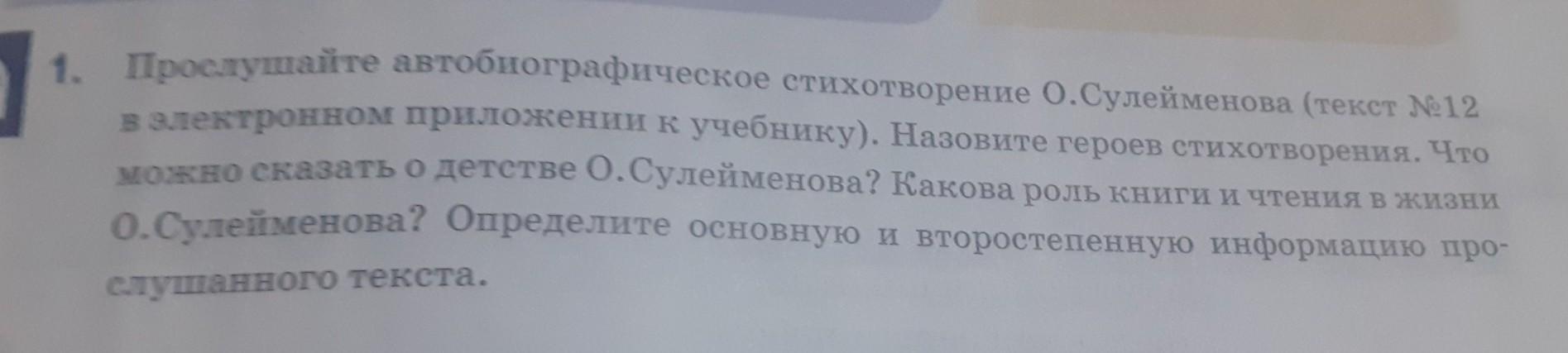 1. Прослушайте автобиографическое стихотворение О.Сулейменова (текст №12 в электронном приложении к учебнику). Назовите героев стихотворения. Что можно сказать о детстве О.Сулейменова? Какова роль книги и чтения в жизни О. Сулейменова? Определите основную и второстепенную информацию про- слушанного текста.