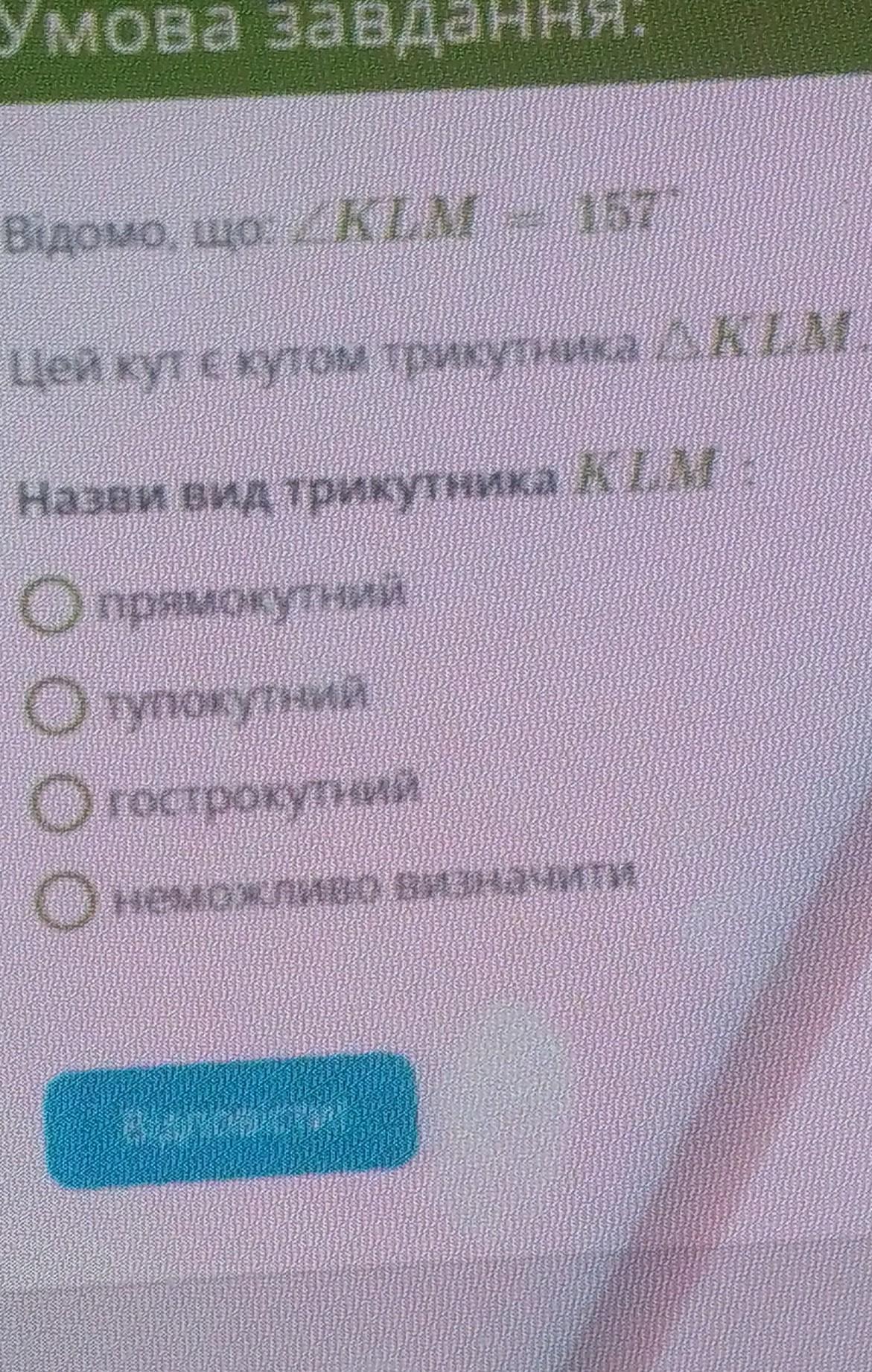 угол KLM больше 90 градусов, а значит тупой. исходя из этого, вид треугольника - тупоугольный