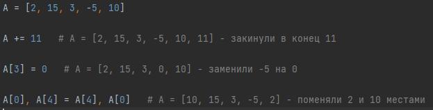 б) Оператор присваивания = , как видно из названия, присваивает какое-то значение элементу списка. В данном случае, элемент списка A с индексом 3 поменяет свое значение на 0. Значит наш список будет иметь вид: