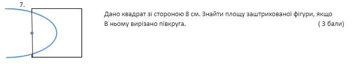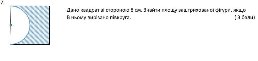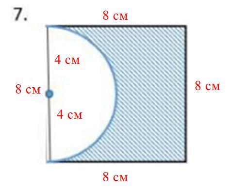 Перевод: Дано квадрат со стороной 8 см. Найти площадь заштрихованной фигуры, если в нем вырезано полкруга.
