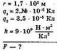 Два заряди 2,3 ∙ 10-6 Кл і 3,5 ∙ 10-6 Кл, які розміщені у вакуумі на відстані 1,7 см, взаємодіють із силою 25,1 ∙ 102 Н.