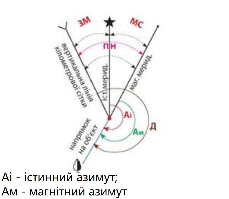 Магнітний азимут-це кут, який вираховують від північного напрямку магнітного меридіана до шуканої точки.