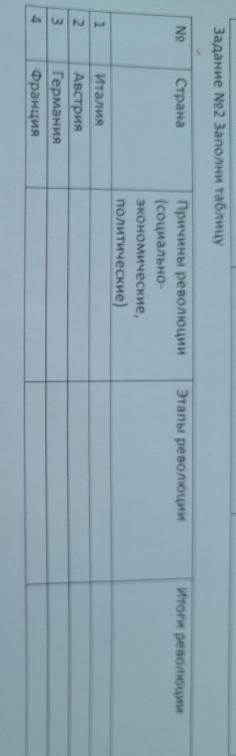 1 3 4 Задание №2 Заполни таблицу Страна No Италия Австрия Германия Франция Причины революции (социально- экономические, политические) Этапы революции Итоги революции