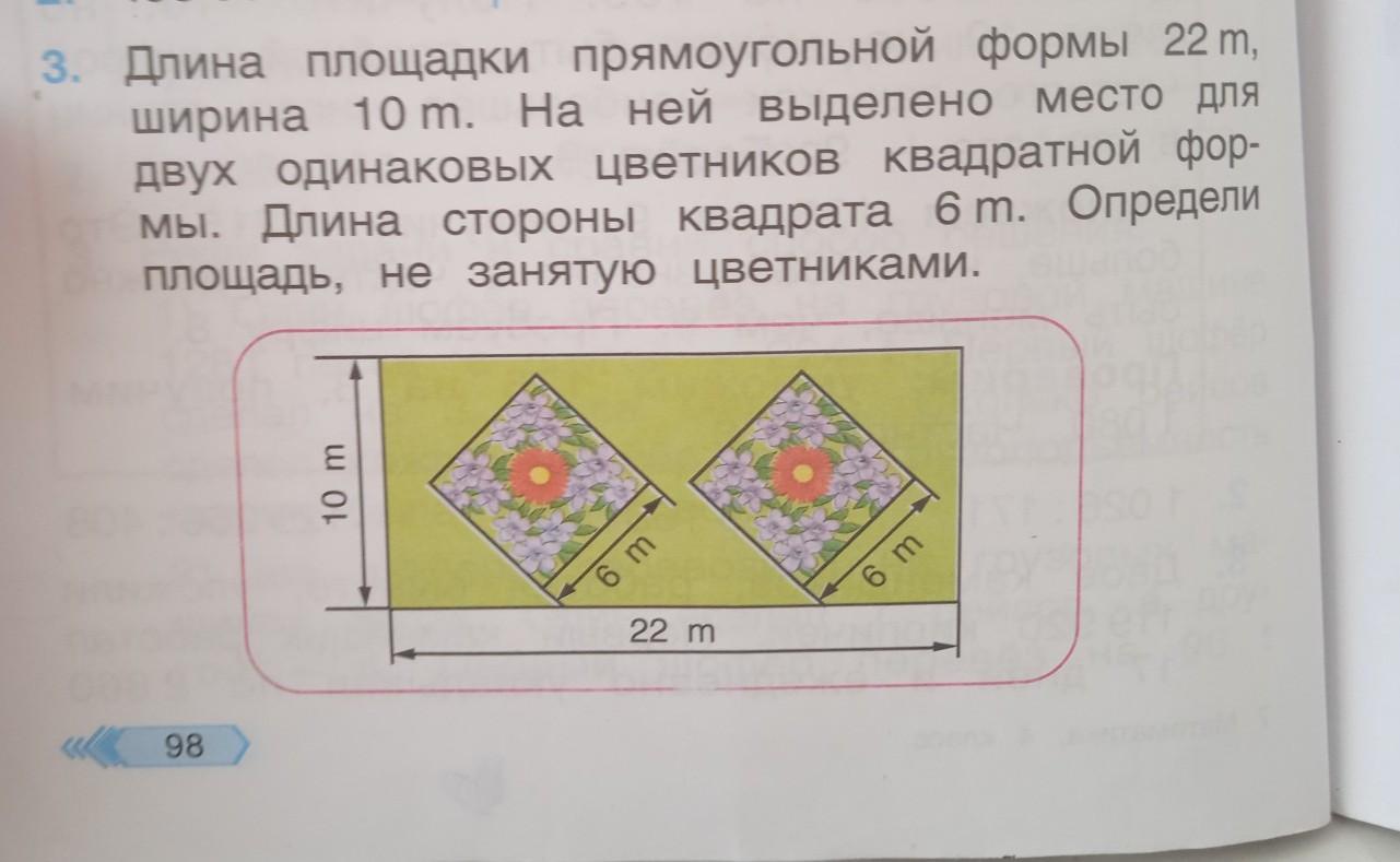 3. Длина площадки прямоугольной формы 22 m, ширина 10 m. На ней выделено место для двух одинаковых цветников квадратной фор- мы. Длина стороны квадрата 6 м. Определи площадь, не занятую цветниками.