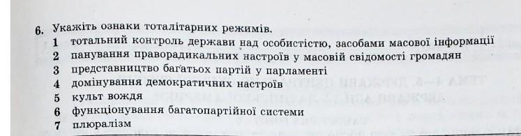 6. Укажіть ознаки тоталітарних режимів. 1 тотальний контроль держави над особистістю, засобами масової інформації 2 панування праворадикальних настроїв у масовій свідомості громадян 3 представництво багатьох партій у парламенті 4 домінування демократичних настроїв 5 культ вождя 6 функціонування багатопартійної системи 7 плюралізм
