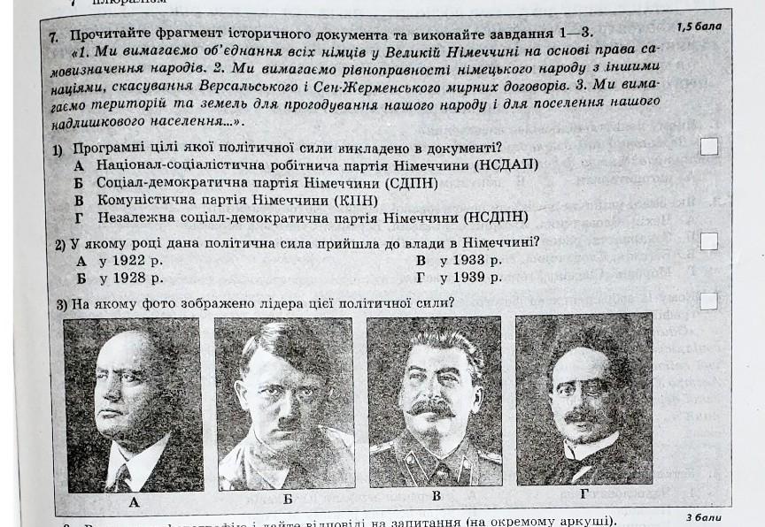 7. Прочитайте фрагмент історичного документа та виконайте завдання 1-3. «1. Ми вимагаємо об'єднання всіх німців у Великій Німеччині на основі права са мовизначення народів. 2. Ми вимагаємо рівноправності німецького народу з іншими націями, скасування Версальського і Сен-Жерменського мирних договорів. 3. Ми вима- гаємо територій та земель для прогодування нашого народу і для поселення нашого надлишкового населення...>>.