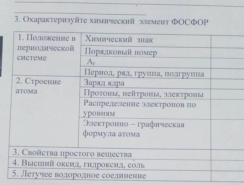 3. Охарактеризуйте химический элемент ФОСФОР 1. Положение в Химический знак периодической Порядковый номер СИСТЕМе 2. Строение атома Ar Период, ряд, группа, подгруппа Заряд ядра Протоны, нейтроны, электроны Распределение электронов по уровням - Электронно - графическая формула атома 3. Свойства простого вещества 4. Высший оксид, гидроксид, соль 5. Летучее водородное соединение