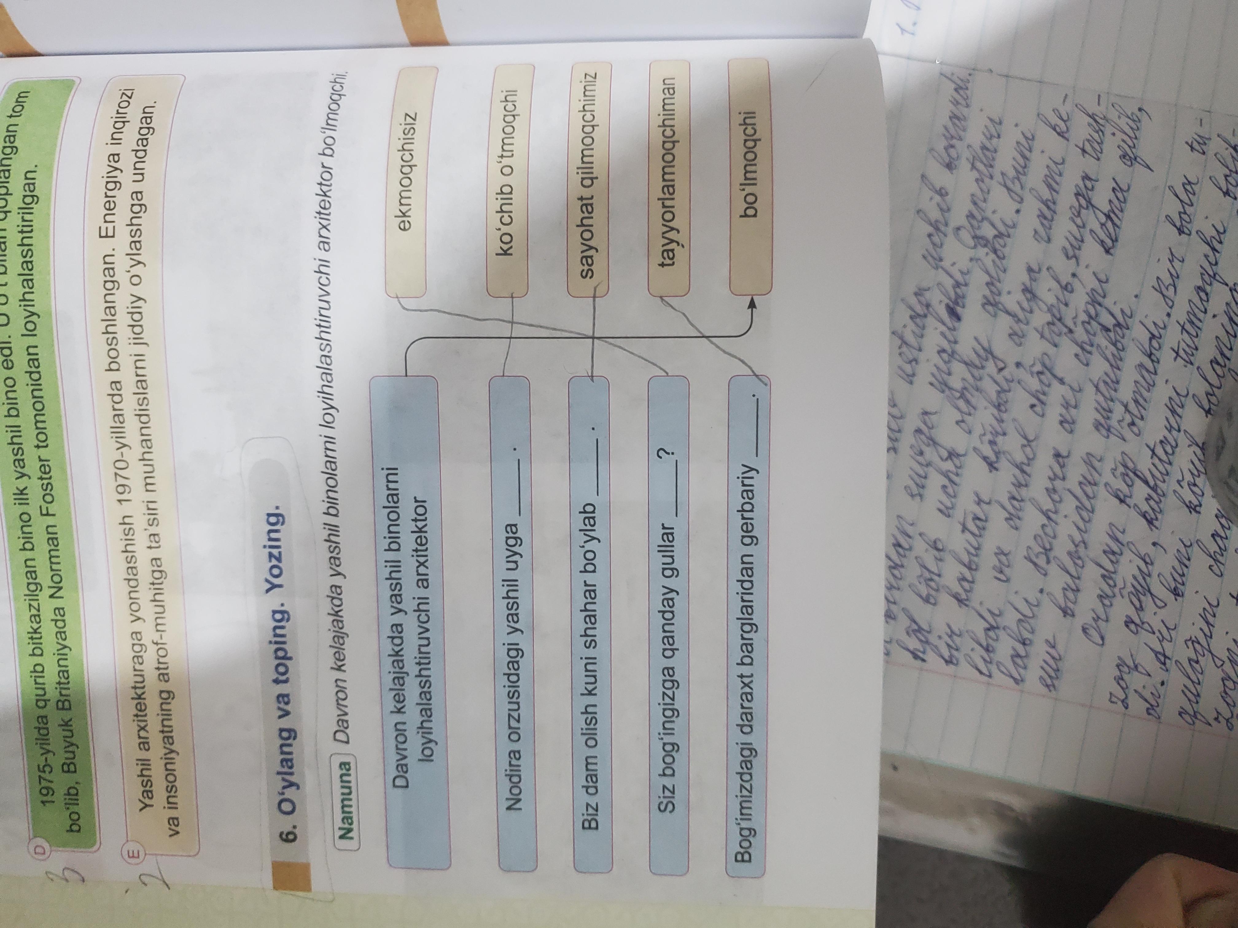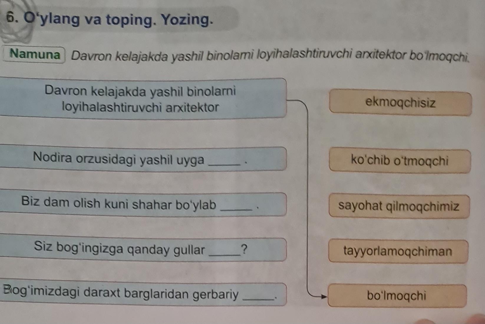 6. O'ylang va toping. Yozing. Namuna Davron kelajakda yashil binolami loyihalashtiruvchi arxitektor bo'lmoqchi. Davron kelajakda yashil binolarni loyihalashtiruvchi arxitektor ekmoqchisiz Nodira orzusidagi yashil uyga _ ko'chib o'tmoqchi Biz dam olish kuni shahar bo'ylab sayohat qilmoqchimiz Siz bog'ingizga qanday gullar _ tayyorlamoqchiman Bog'imizdagi daraxt barglaridan gerbariy … bo'lmoqchi