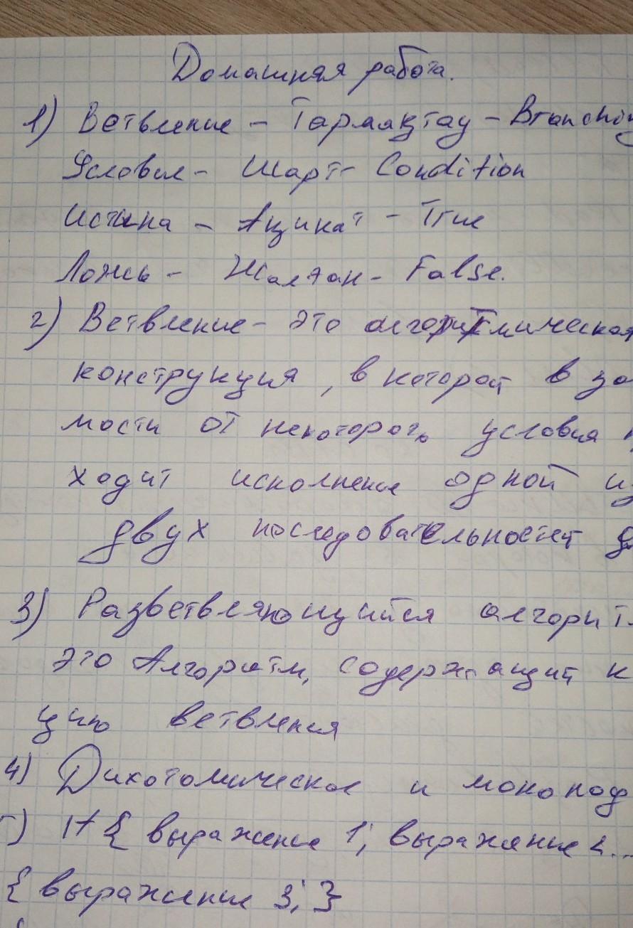 1. Произнесите на трех языках ключевые слова. 2. Что такое ветвление? 3. Что такое разветвляющийся алгоритм? 4. Какие виды ветвлений существуют? 5. Как записывается конструкция ветвления в Python? 6. Расскажите принцип работы оператора ветвления. 7. Какие операции сравнения вам известны? 8. Зачем используются отступы у команд, находящихся внутри ветвления?