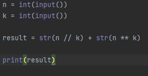 Соня и Вася играют в разведчиков. Из двух чисел n и k Соня составила шифр и велела Васе найти неполное частное при делении n на k и n в степени k. Два полученных числа она записала слитно (без пробела, «приклеив» друг к другу). Получилась шифровка. Даны числа n и k. Выведите Сонину шифровку. Ввод Вывод 2 3 08