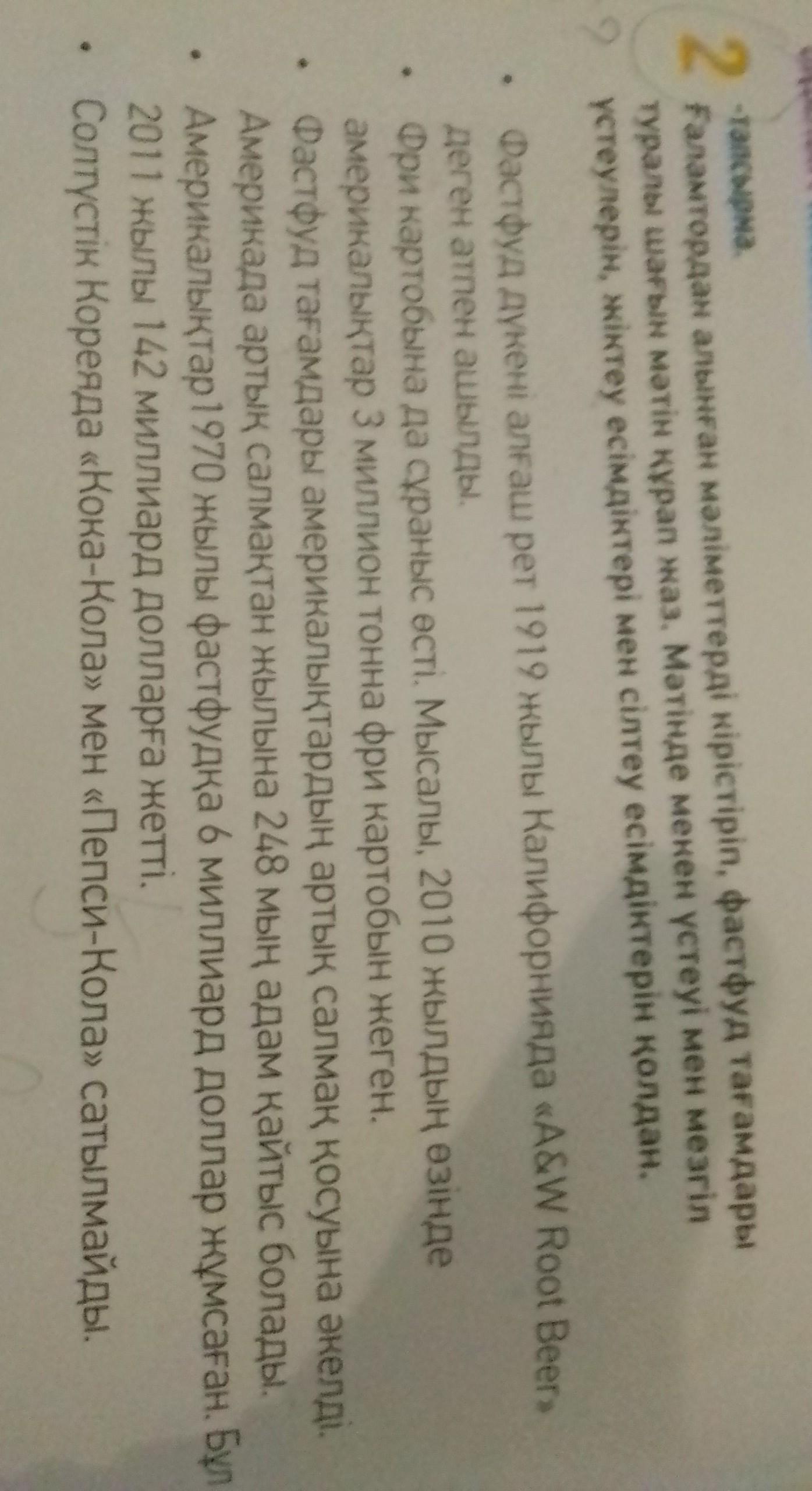 1)Фастфуд дүкені қашан ашылды?2) Америкалықтар 2010 жылы қанша фри картобын жеді?3)Америкада қанша адам артық салмақтан өледі?4) Америкалықтар 1970жылы қанша доллар жұмсаған?5)Соңтүстік Кореяда не сатылмайды?