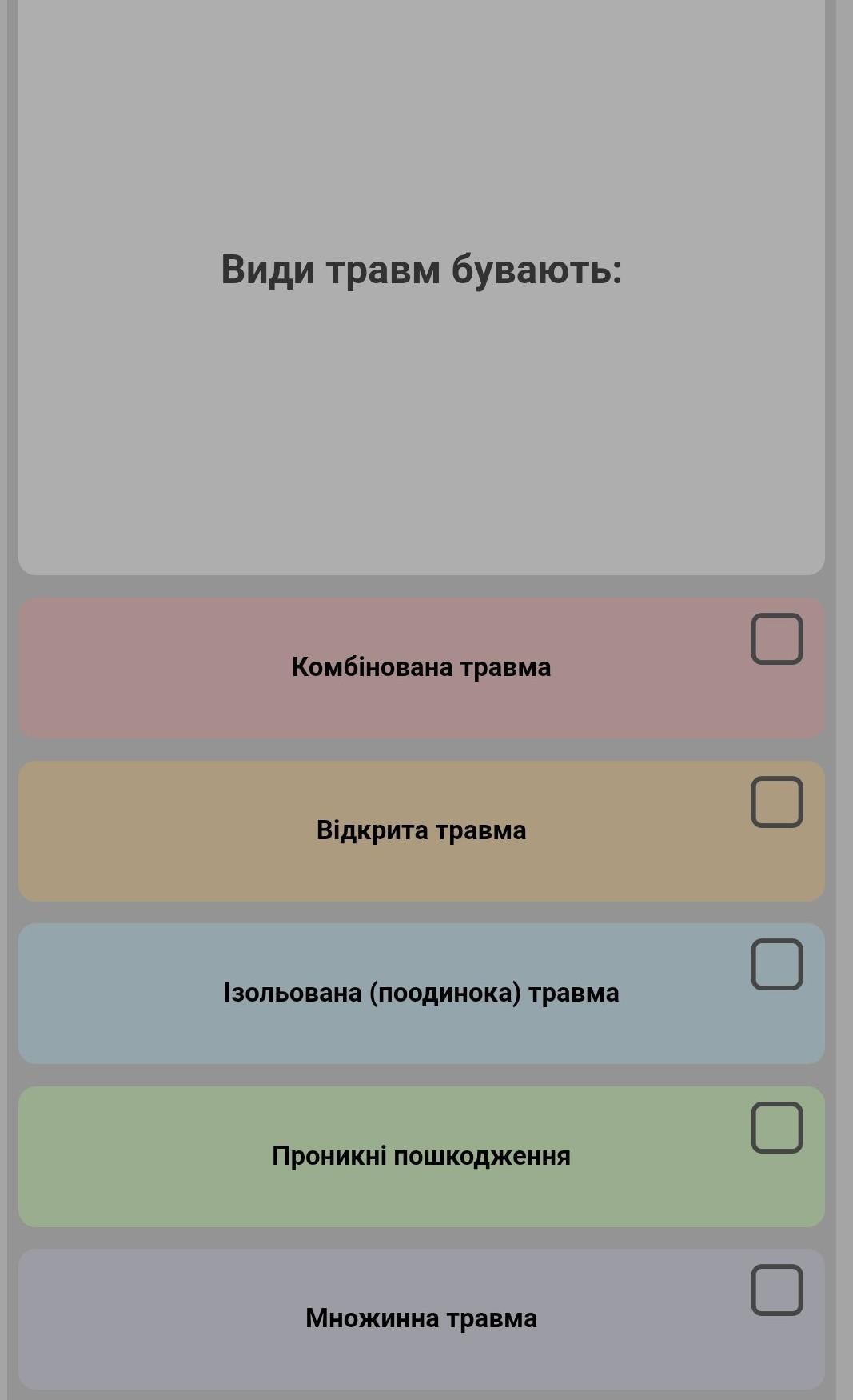 До основних видів травм належать: механічні, фізичні, хімічні, біологічні та комбіновані травми