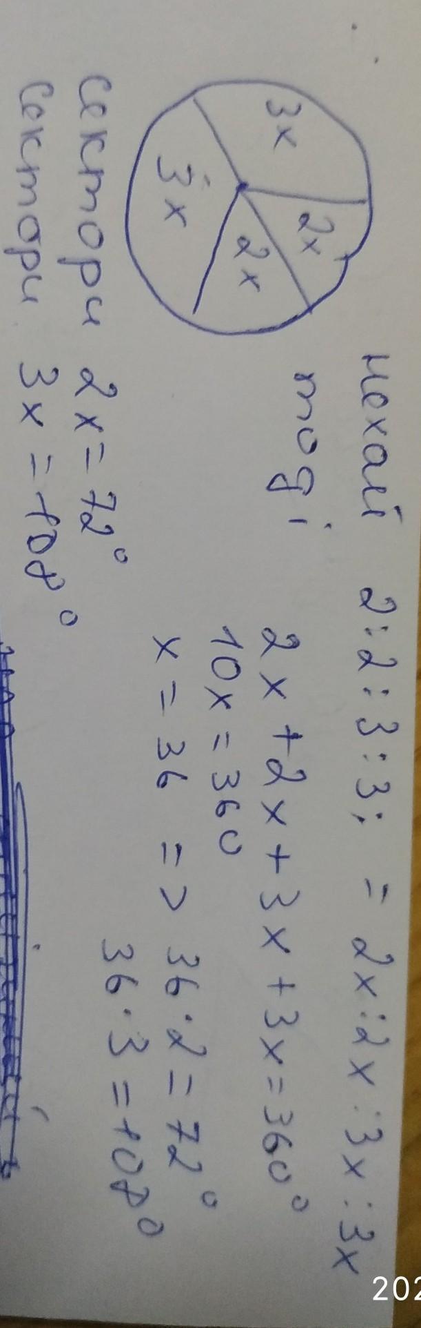 Круг поділено на 4 сектори, що відносяться як 2:2:3:3.