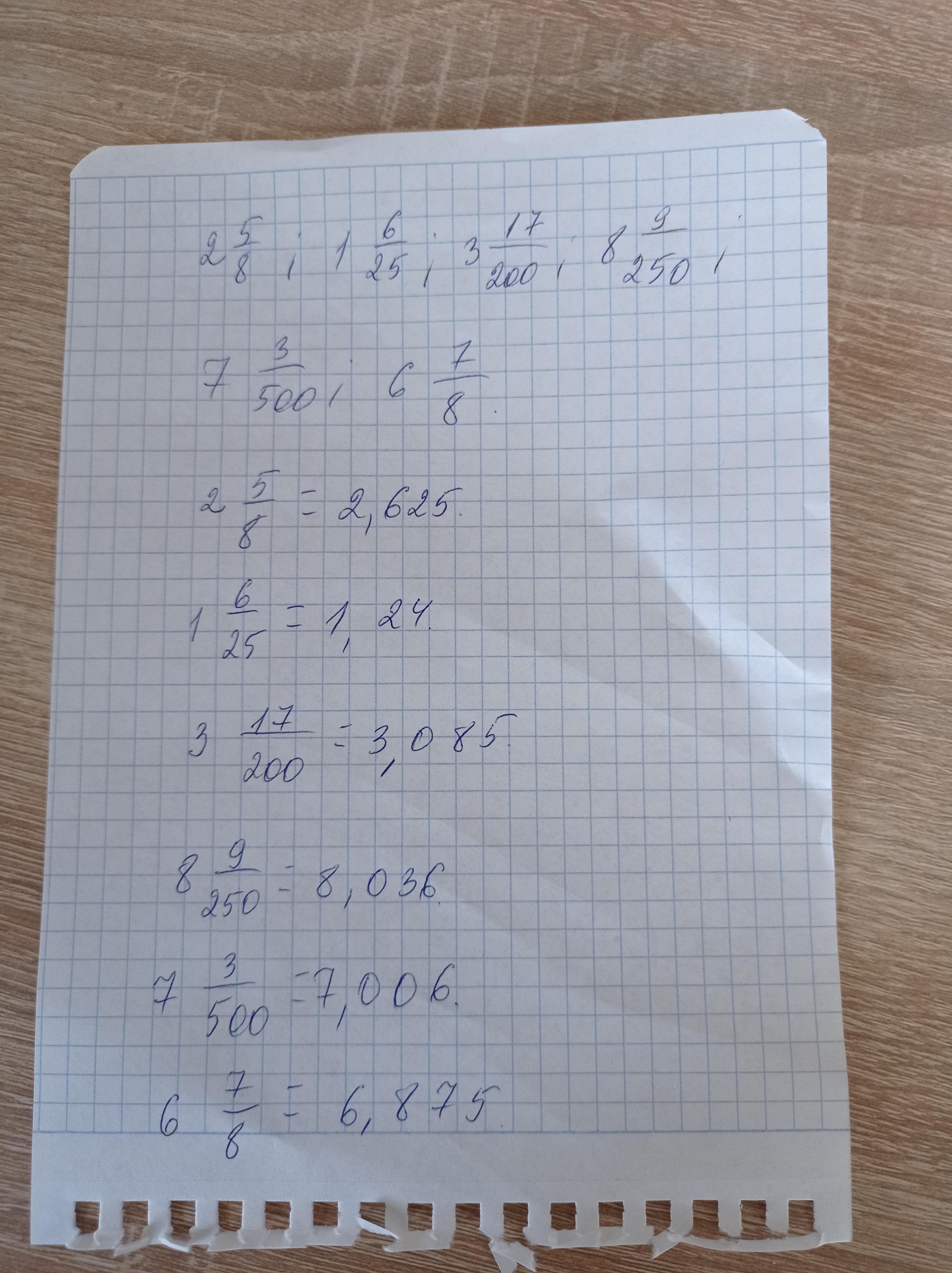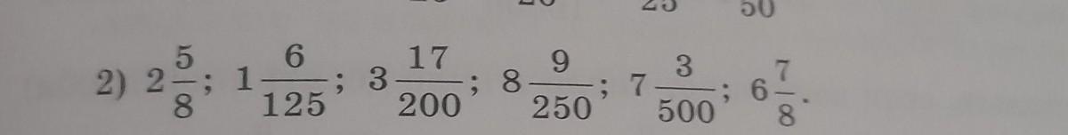 741. Запишите в виде десятичных дробей смешанные числа: 3 13 : 2:4 50 50 1) 3- 20 2) ; 6 125 : 3 25 ; 7 17 200 20 ; 8 4 ; 12; 9 25 9 250 ; 7 3 500 ; 6 8