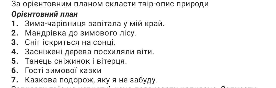 З самого початку грудня, всі чекали приход зими. Сьогодні, прокинувшись та зазирнувши у вікно, я побачил(а) двір, весь покритий снігом. Він так і манив мене пройтись по ньому та почути цей звук, коли наступаєш на тільки випавший сніг. Я одразу вирішив(ла) піти прогулятись до зимового лісу. Швидко одягнувшись, я пішов(ла) до нього. По дорозі, я помітив(ла), що всі до останнього домівки були покрити білим сніжним покривалом, а колись квітучи кущі та дерева засипані снігом.