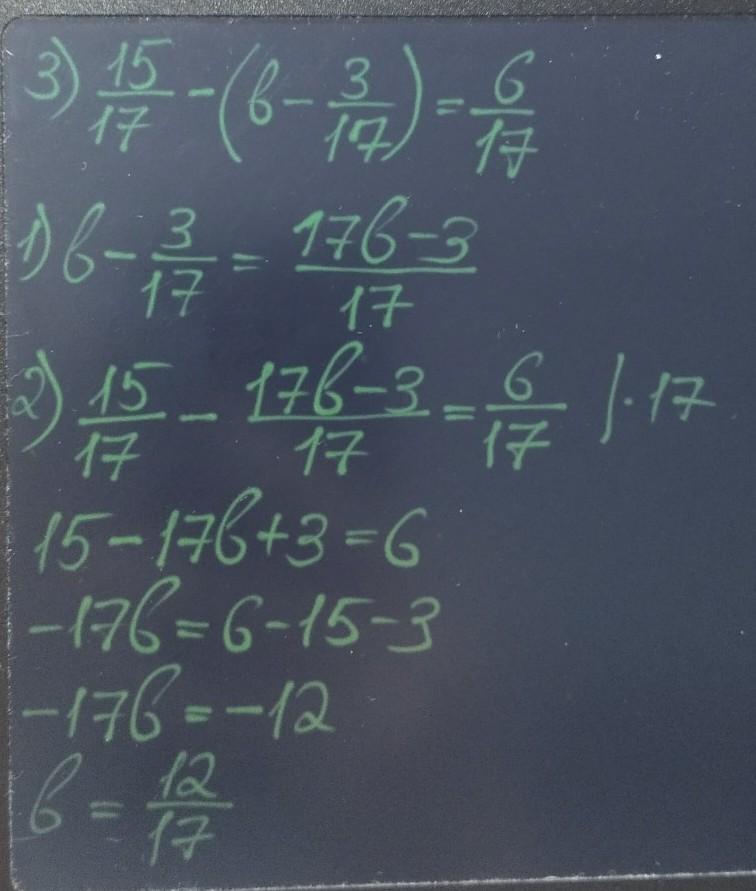 Відповідь: 3) b-3/17= 15/17-6/17; b-3/17= 9/17; b=9/17+3/17; b=12/17
