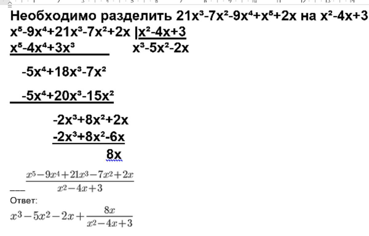 Необходимо разделить 21x³-7x²-9x⁴+x⁵+2x на x²-4x+3