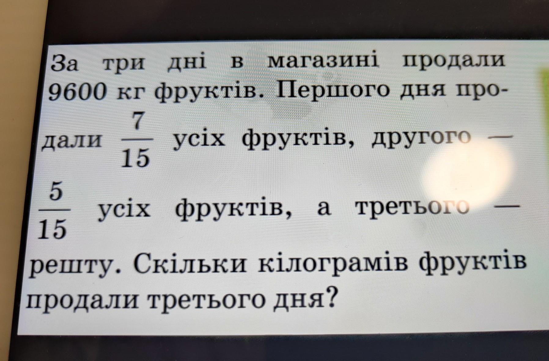 ДАЮ 100 БАЛОВ ДОПОМОЖІТЬ За три дні в магазині продали 9600 кг фруктів. Першого дня про- 7 дали усіх фруктів, другого 15 - 5 усіх фруктів, а третього 15 решту. Скільки кілограмів фруктів продали третього дня? ―