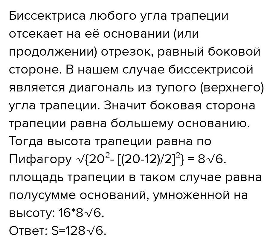Основи рівнобічної трапеції дорівнюють 12 см і 20 см, а діа- гональ є бісектрисою тупого кута трапеції. Знайдіть цю діа. гональ.