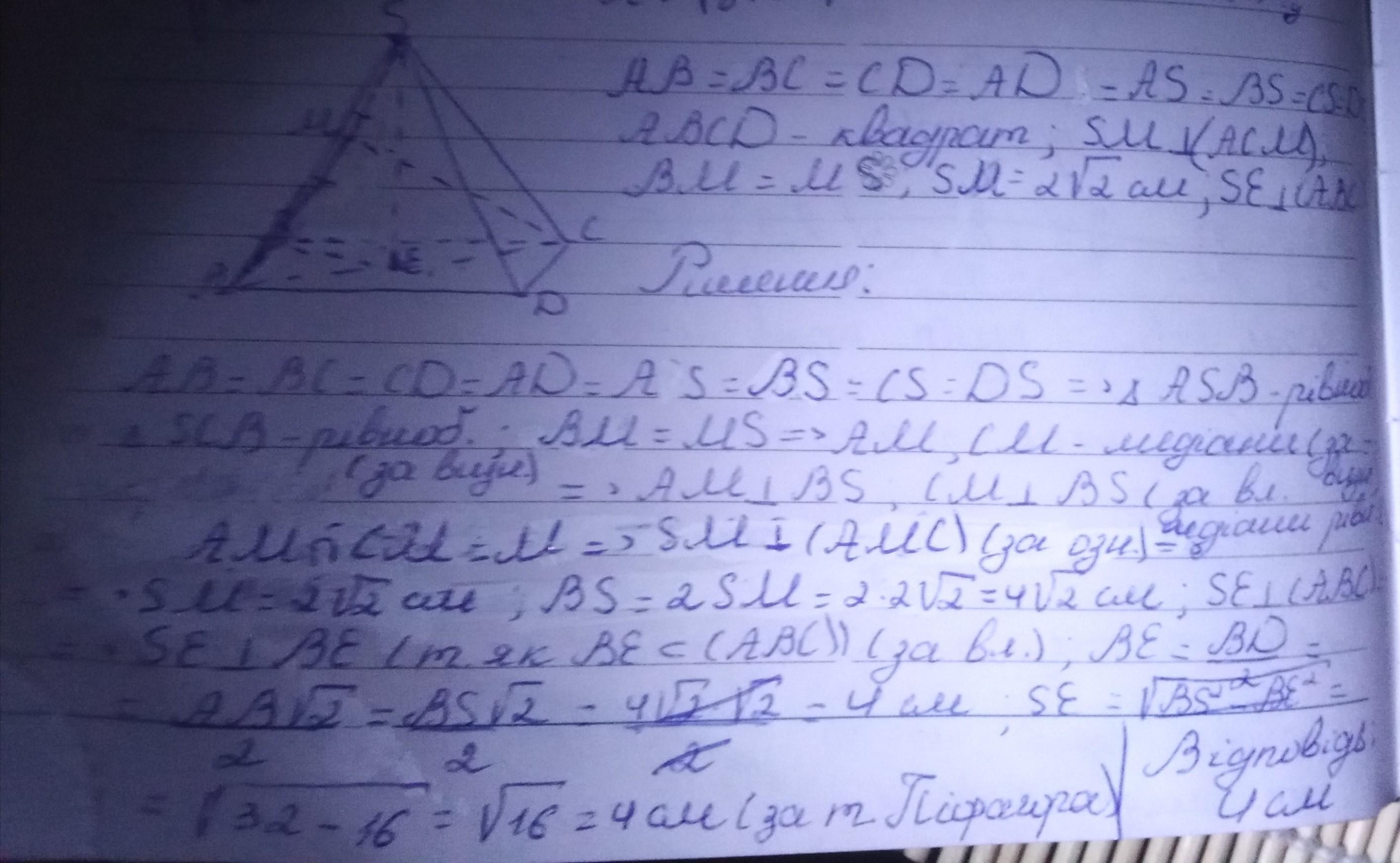 Основа піраміди SABCD- квадрат ABCD, а всі ребра піраміди рівні. Знайти відстань від вершини S піраміди до площини ABC, якщо відстань від точки S до площини ACM, де M-середина ребра SB дорівнює 2√2 см