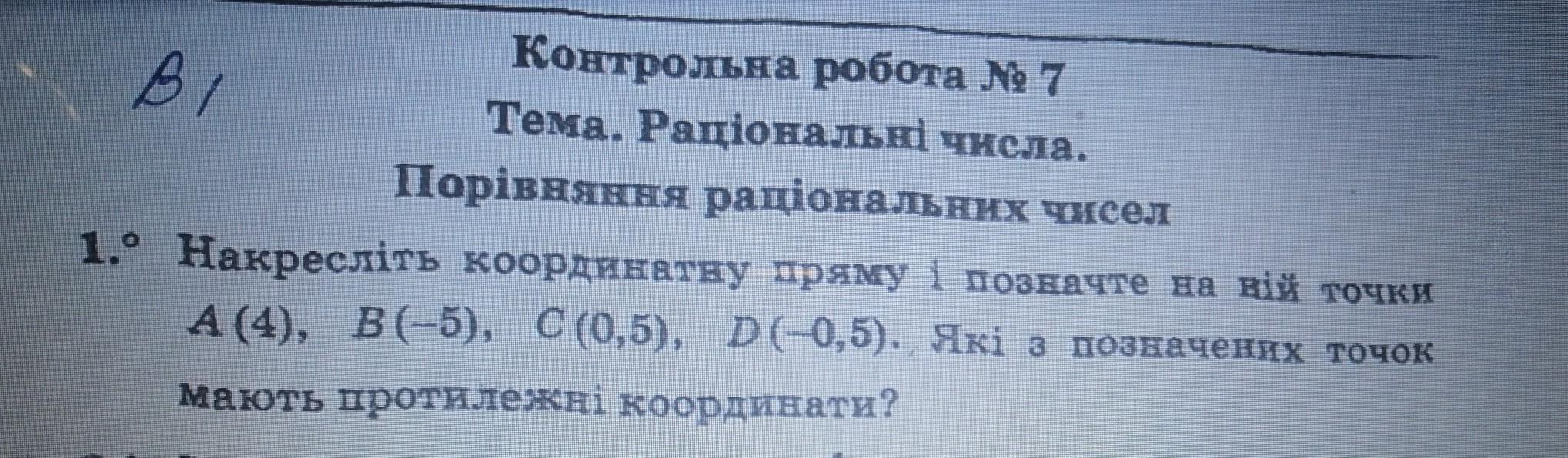 1.° Накресліть координатну пряму с A(4), B(-5), C(0,5), D(-0,5). протилежні координати? мають і позначте на ній точки Які з позначених точок