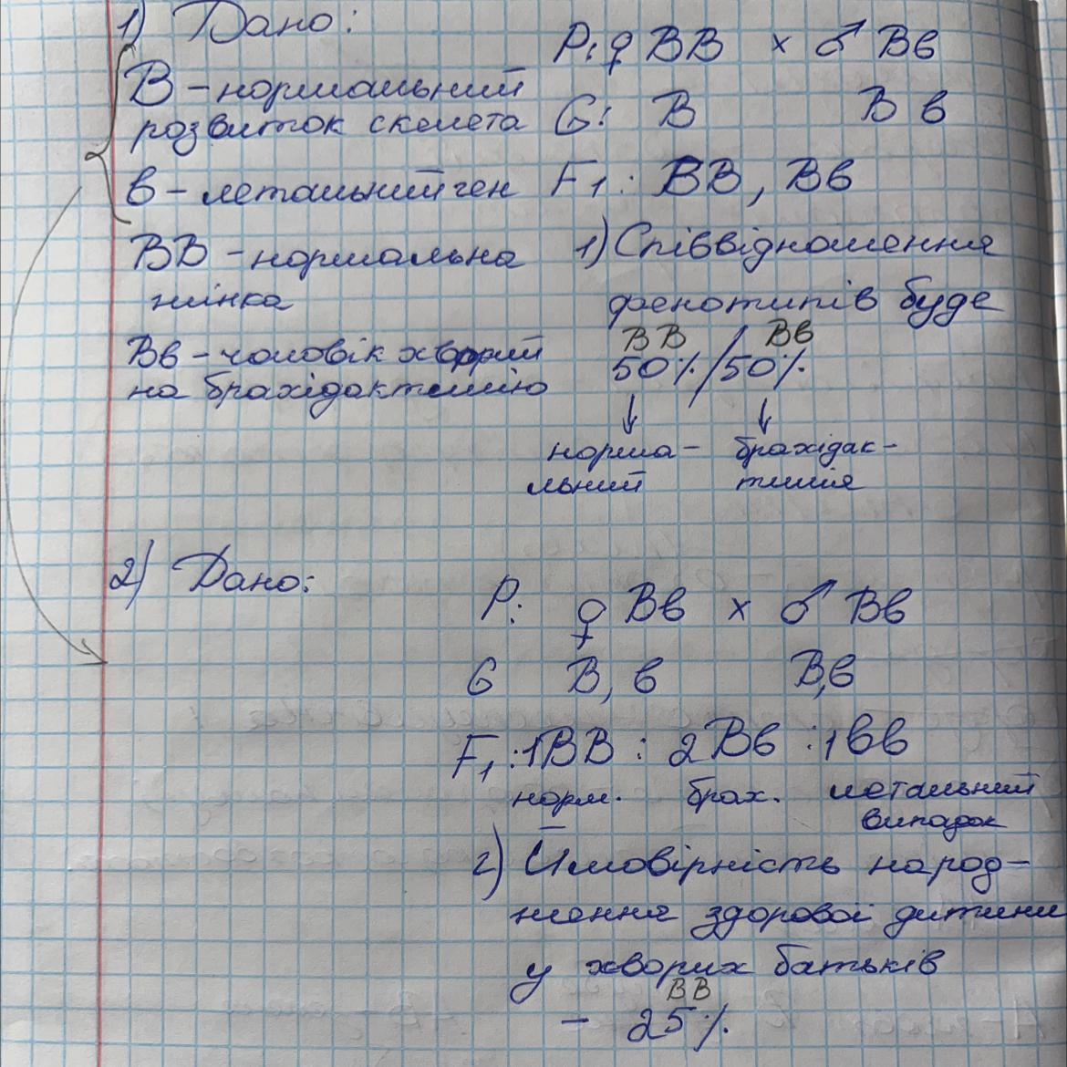 1) Співвідношення фенотипі від шлюбу нормальної жінки і чоловіка хворого на брахіжактилію слід очікувати 50%/50%