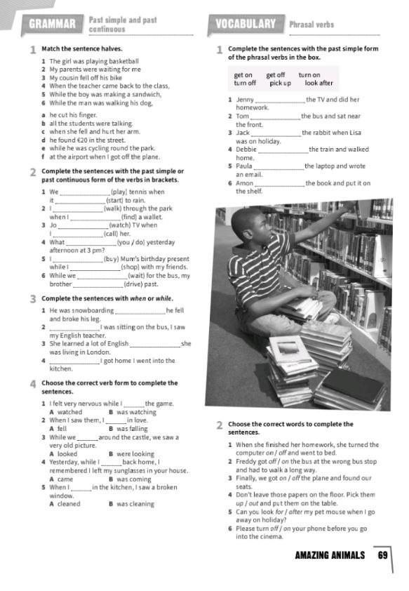 GRAMMAR 1 Match the sentence halves. 1 The girl was playing basketball 2 My parents were waiting for me 3 My cousin fell off his bike 4 When the teacher came back to the class, 5 While the boy was making a sandwich, & While the man was walking his dog. a he cut his finger. b all the students were talking c when she fell and hurt her arm. d he found €20 in the street. e while he was cycling round the park. f at the airport when I got off the plane. 2 Complete the sentences with the past simple or past continuous form of the verbs in brackets. 1 We it, 21 Past simple and past continuous when!, 3 Jo 1 4 What 2 while While we brother afternoon at 3 pm? (play] tennis when (start) to rain. (walk) through the park (find) a wallet. 3 While we 3 Complete the sentences with when or while. 1 He was snowboarding... he fell and broke his leg. (watch) TV when (call) her. very old picture. A looked s When! (you/do) yesterday my English teacher. 3 She learned a lot of English_ was living in London. window. A cleaned (buy) Mum's birthday present (shop) with my friends. (wait) for the bus, my (drive) past. kitchen. 4 Choose the correct verb form to complete the sentences. I was sitting on the bus, I saw 1 I felt very nervous while I A watched 2 When I saw them, 1_ A fell got home I went into the the game. B was watching in love. B was falling around the castle, we saw a B were looking 4 Yesterday, while 1 back home, I remembered I left my sunglasses in your house. A came she B was coming in the kitchen, I saw a broken B was cleaning VOCABULARY Phrasal verbs 1 Complete the sentences with the past simple form of the phrasal verbs in the box. get on turn off 1 Jenny homework. 2 Tom the front. 3 Jack get off 4 Debbie home, 5 Paula was on holiday. an email. Amon the shelf. pick up turn on 01 look after the TV and did her the bus and sat near the rabbit when Lisa the train and walked the laptop and wrote the book and put it on 2 Choose the correct words to complete the sentences. 1 When she finished her homework, she turned the computer on/ off and went to bed. 2 Freddy got off/ on the bus at the wrong bus stop and had to walk a long way. 3 Finally, we got on/ off the plane and found our seats. 4 Don't leave those papers on the floor. Pick them up/out and put them on the table. $ Can you look for/after my pet mouse when I go away on holiday? 6 Please turn off/ on your phone before you go into the cinema.