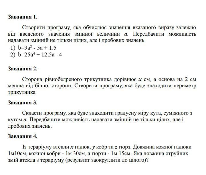 Завдання 1. Створити програму, яка обчислює значення вказаного виразу залежно від введеного значення змінної величини а. Передбачити можливість надавати змінній не тільки цілих, але і дробових значень. 1) b=9a² - 5a + 1.5 2) b=25a+ + 12,5a-4 Завдання 2. Сторона рівнобедреного трикутника дорівнює х см, а основа на 2 см менша від бічної сторони. Створити програму, яка буде знаходити периметр трикутника. Завдання 3. Скласти програму, яка буде знаходити градусну міру кута, суміжного з кутом а. Передбачити можливість надавати змiннiй не тільки цілих, але і дробових значень. Завдання 4. Із тераріуму втекли х гадюк, у кобр та z гюp3. Довжина кожної гадюки 1м10см, кожної кобри- 1м 30см, а гюрзи - 1м 15см. Яка довжина отруйних змiй втекла з тераріуму (результат заокруглити до цілого)?