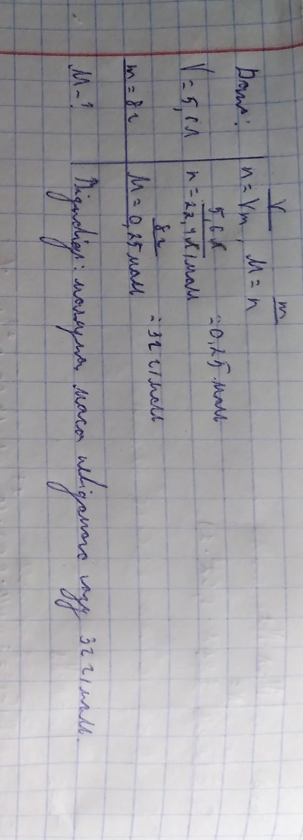 Допоможіть мені будь ласочка! Дуже прошу написати з дано та розв'язанням. 5.6 л (н.у.) деякого газу мають масу 8 г. Обчисліть молярну масу невідомого газу.
