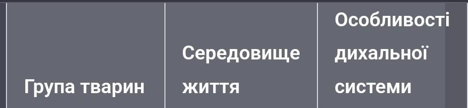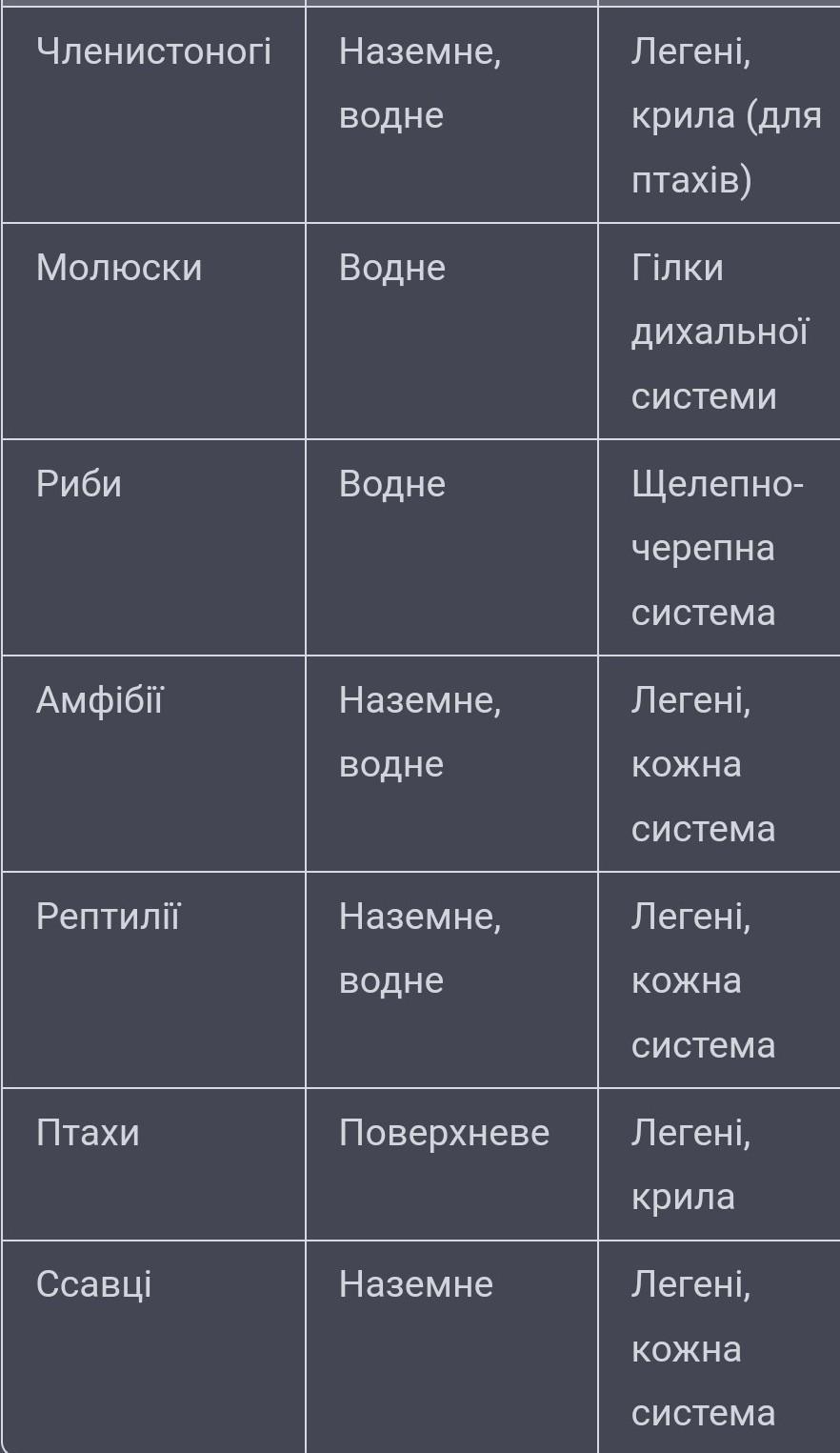 Наступна таблиця містить основні особливості будови дихальної системи різних груп тварин: