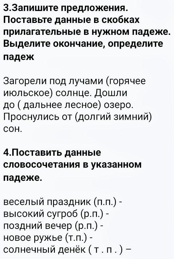 3. Загорели под лучами (чего?) горячего июльского (Р.п.) солнца. Дошли до (чего?) дальнего лесного (Р.п.) озера. Проснулись от (чего?) долгого зимнего (Р.п.) сна.