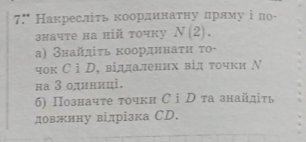 -" Накресліть координатну пряму і по- значте на нiй точку N (2). а) Знайдіть координати то- чок С i D, віддалених від точки N на 3 одиниці. б) Позначте точки С i D та знайдіть довжину відрізка CD.