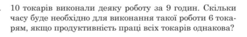 10 токарів виконали деяку роботу за 9 годин. Скільки часу потрібно буде 6 токарям якщо продуктивність праці всіх токарів однакова?